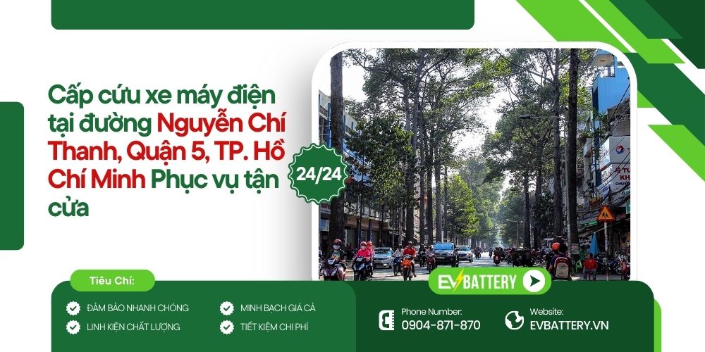 Với lợi thế đội ngũ kỹ thuật viên giàu kinh nghiệm, EVBattery tự tin là đơn vị cứu hộ xe máy điện uy tín top đầu Việt Nam, luôn sẵn sàng hỗ trợ khách hàng tại đường Nguyễn Chí Thanh và các tuyến đường lân cận thuộc Quận 5.