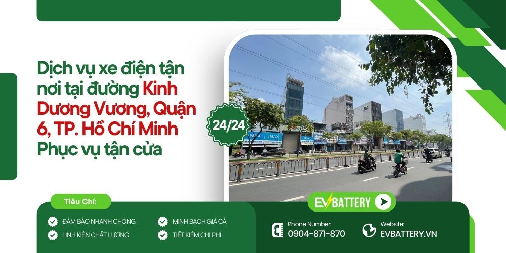 EVBattery cung cấp dịch vụ xe điện tận nơi tại đường Kinh Dương Vương, luôn sẵn sàng phục vụ bạn mọi lúc.