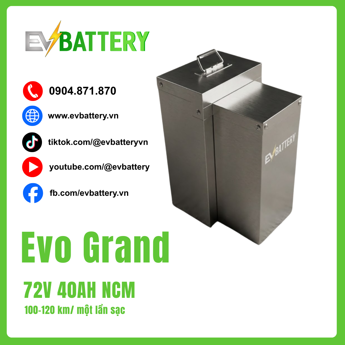 Sở hữu pin riêng cho VinFast Evo Grand/200 với giá 11.490.000 VNĐ. Gói pin 72V 40AH NCM giúp xe đi được 100-120 km. Giải pháp hoàn hảo để cắt đứt chi phí thuê pin hàng tháng.
