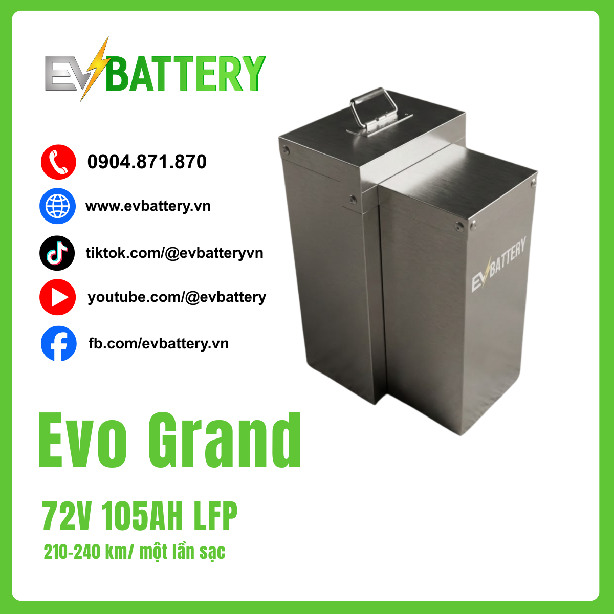 Pin khủng 72V 105AH LFP cho Evo Grand. Giá 20.490.000 VNĐ, quãng đường 210-240 km. Sự kết hợp giữa dung lượng khổng lồ và độ bền vô đối của LFP.