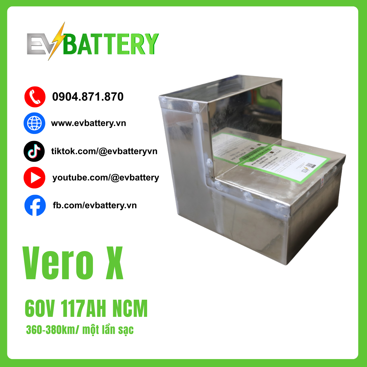 Pin EVBattery 60V 117AH NCM cho Vero X Nâng tầm trải nghiệm lái Vero X với pin 60V 117AH NCM. Khối pin này cung cấp một quãng đường di chuyển ấn tượng, đạt từ 360 đến 380 km cho một lần sạc.