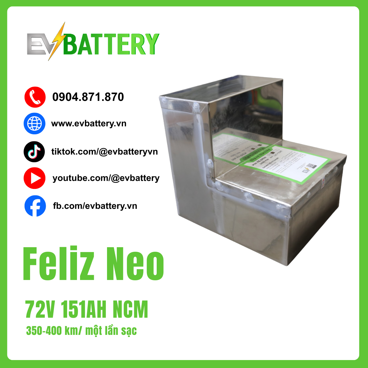 Pin EVBattery 72V 151AH NCM cho Feliz Neo Chạm đến đỉnh cao hiệu suất cho Feliz Neo với pin 72V 151AH NCM. Đây là phiên bản dung lượng “khủng”, mang đến quãng đường di chuyển không tưởng từ 350-400 km.