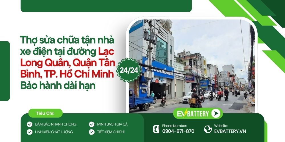 Hãy liên hệ ngay với EVBattery qua số điện thoại 0904 871 870 để được tư vấn nhanh tình trạng xe, đặt lịch cứu hộ tận nhà tại đường Lạc Long Quân, Quận Tân Bình, và trải nghiệm dịch vụ sửa chữa uy tín, nhanh chóng, chuyên nghiệp hàng đầu Việt Nam.